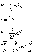 Problem 1: Imagine an inverted right circular cone of height 5m and radius 3m filled to the brim with sand. It is located above a right cylinder of height 10m and radius 15m. Find the rate at of which the pile of sand is growing in the cylinder if the depth of the sand in the cone is decreasing at a rate of 0.5m/s and is at a depth of 3m. Assume that the sand that flows into the cylinder uniformly.